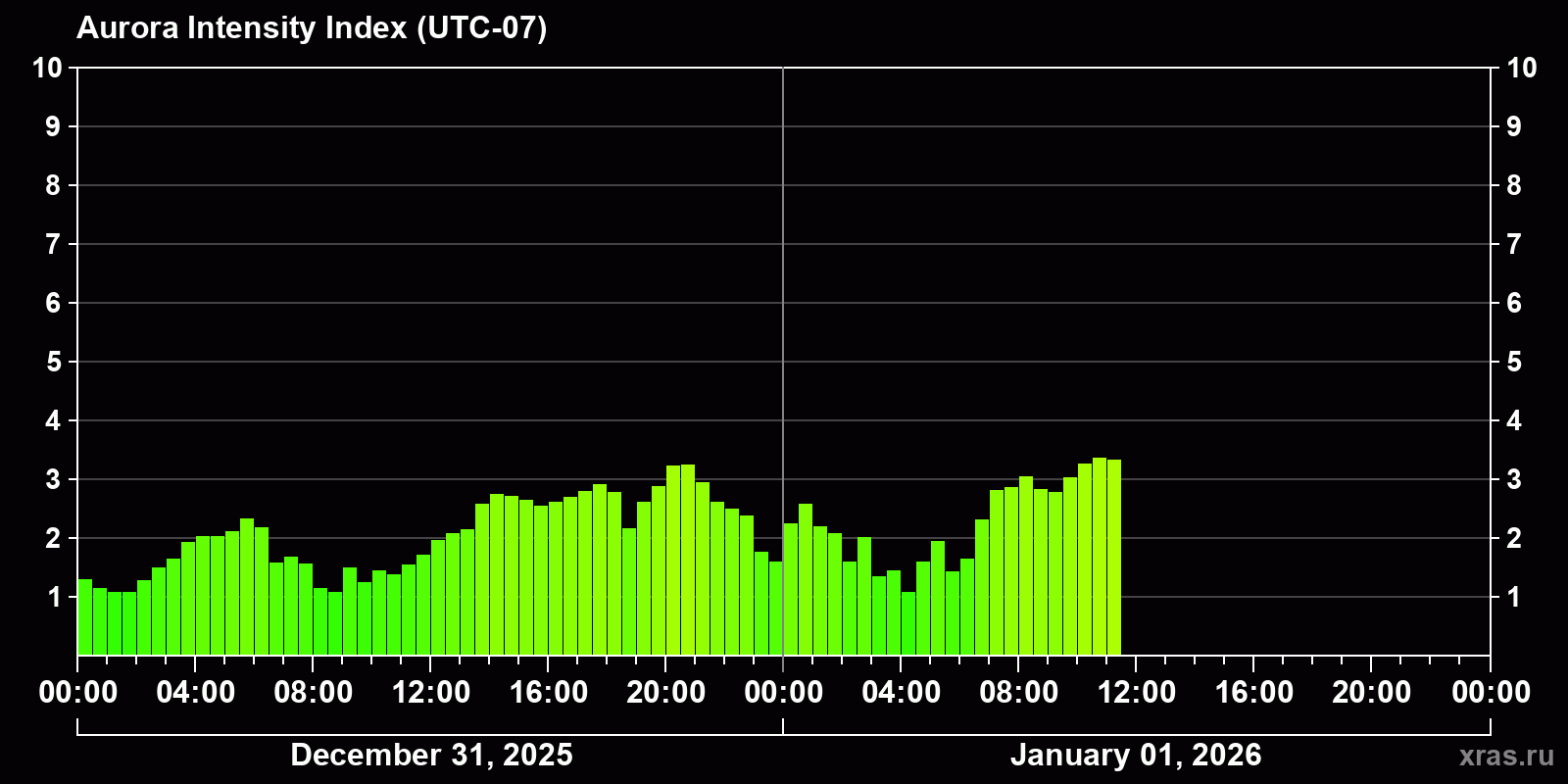 Auroral intensity index and the theoretically possible latitude of observations for nighttime in the Western Hemisphere as of 2026-01-01 07:35 (end of day) local time