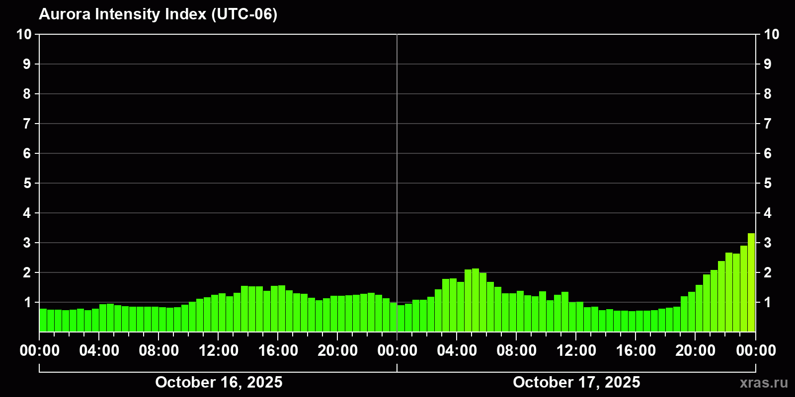Auroral intensity index and the theoretically possible latitude of observations for nighttime in the Western Hemisphere as of 2025-10-17 23:47 (end of day) local time
