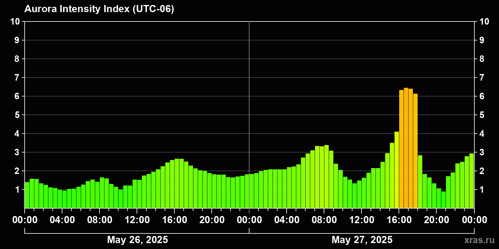 Changes in the auroral intensity index from 2025-05-26 to 2025-05-27 local time