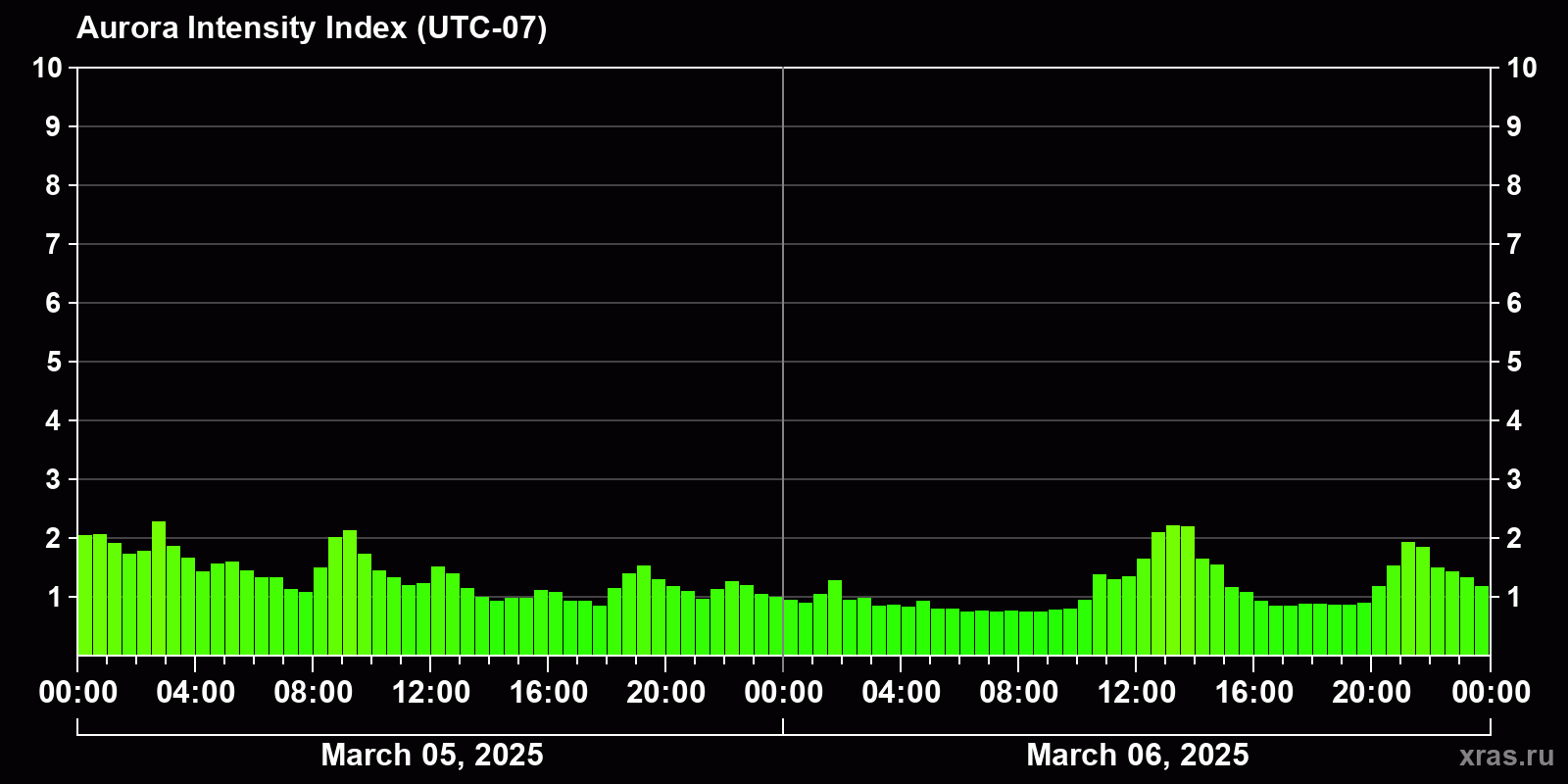 Auroral intensity index and the theoretically possible latitude of observations for nighttime in the Western Hemisphere as of 2025-03-06 23:57 (end of day) local time