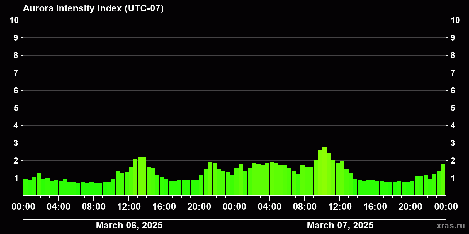 Auroral intensity index and the theoretically possible latitude of observations for nighttime in the Western Hemisphere as of 2025-03-07 23:55 (end of day) local time