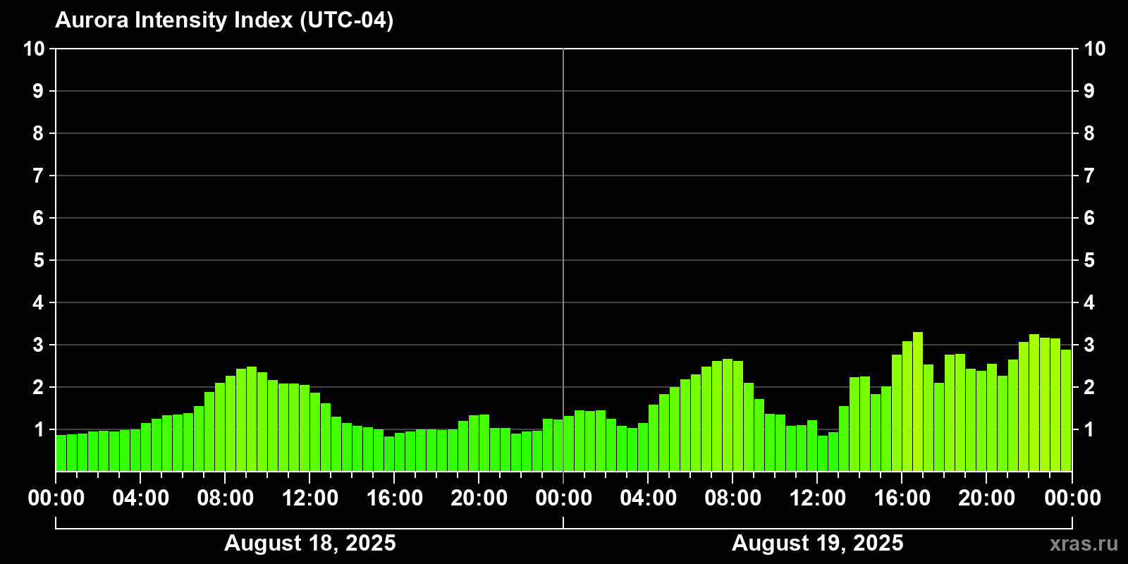 Auroral intensity index and the theoretically possible latitude of observations for nighttime in the Western Hemisphere as of 2025-08-19 23:51 (end of day) local time