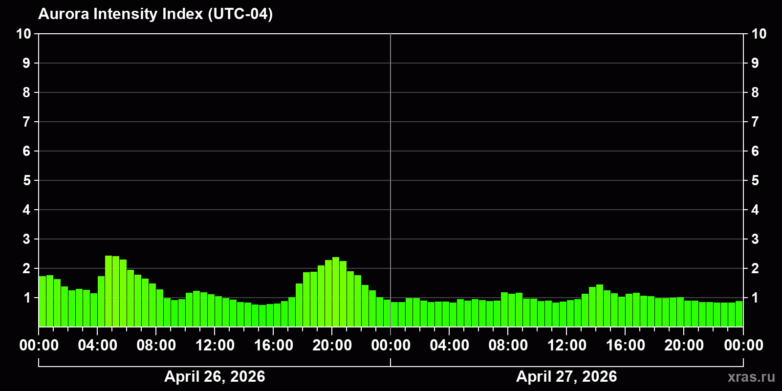 Changes in the auroral intensity index from 2026-04-26 to 2026-04-27 local time