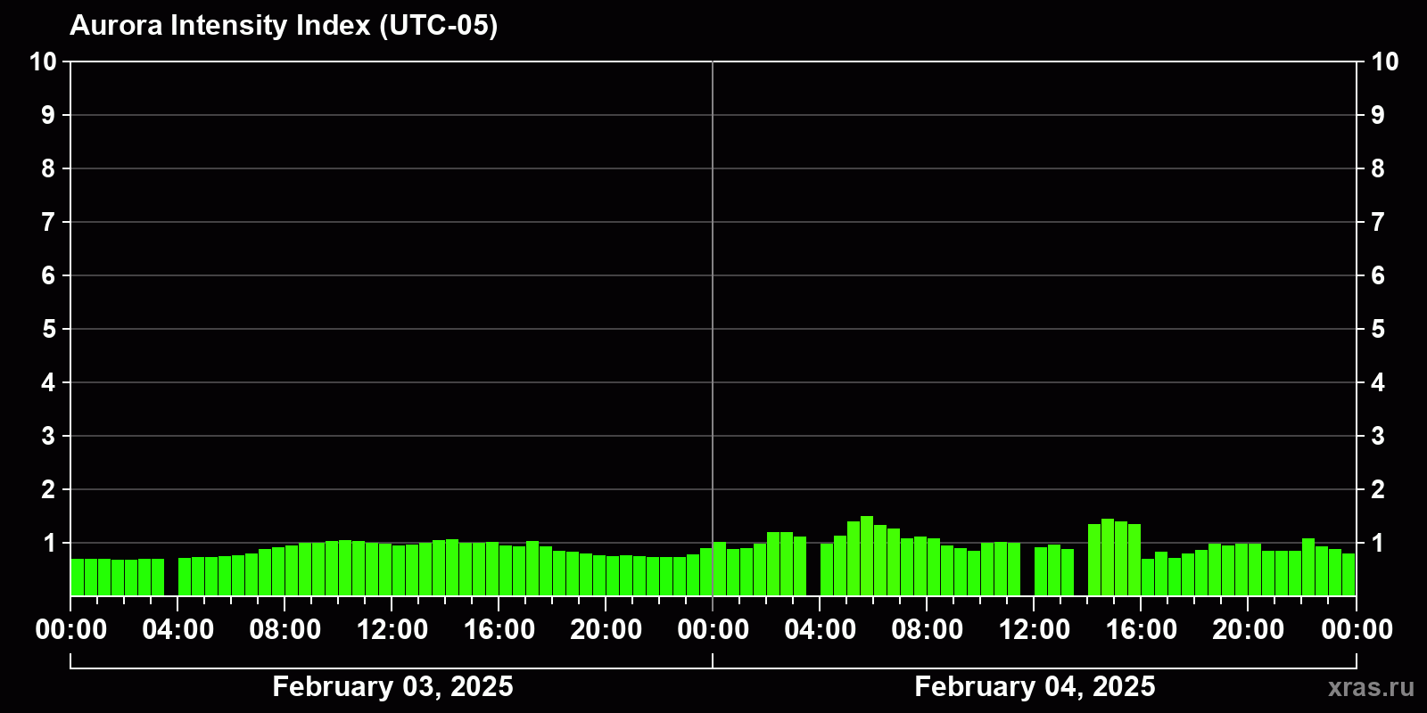 Auroral intensity index and the theoretically possible latitude of observations for nighttime in the Western Hemisphere as of 2025-02-04 23:48 (end of day) local time