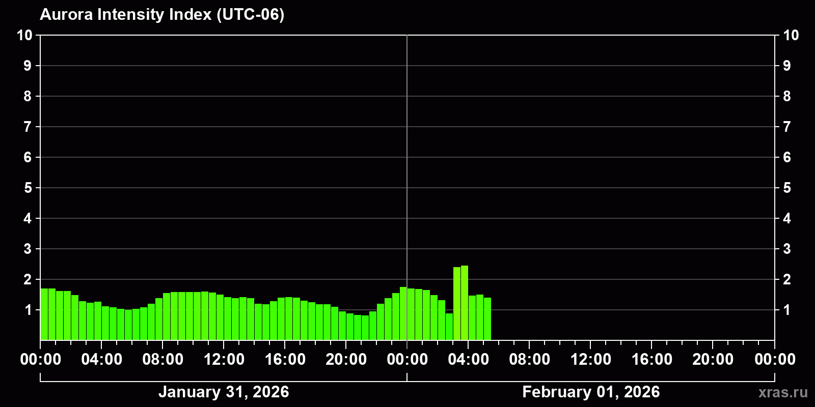 Auroral intensity index and the theoretically possible latitude of observations for nighttime in the Western Hemisphere as of 2026-02-01 03:13 (end of day) local time