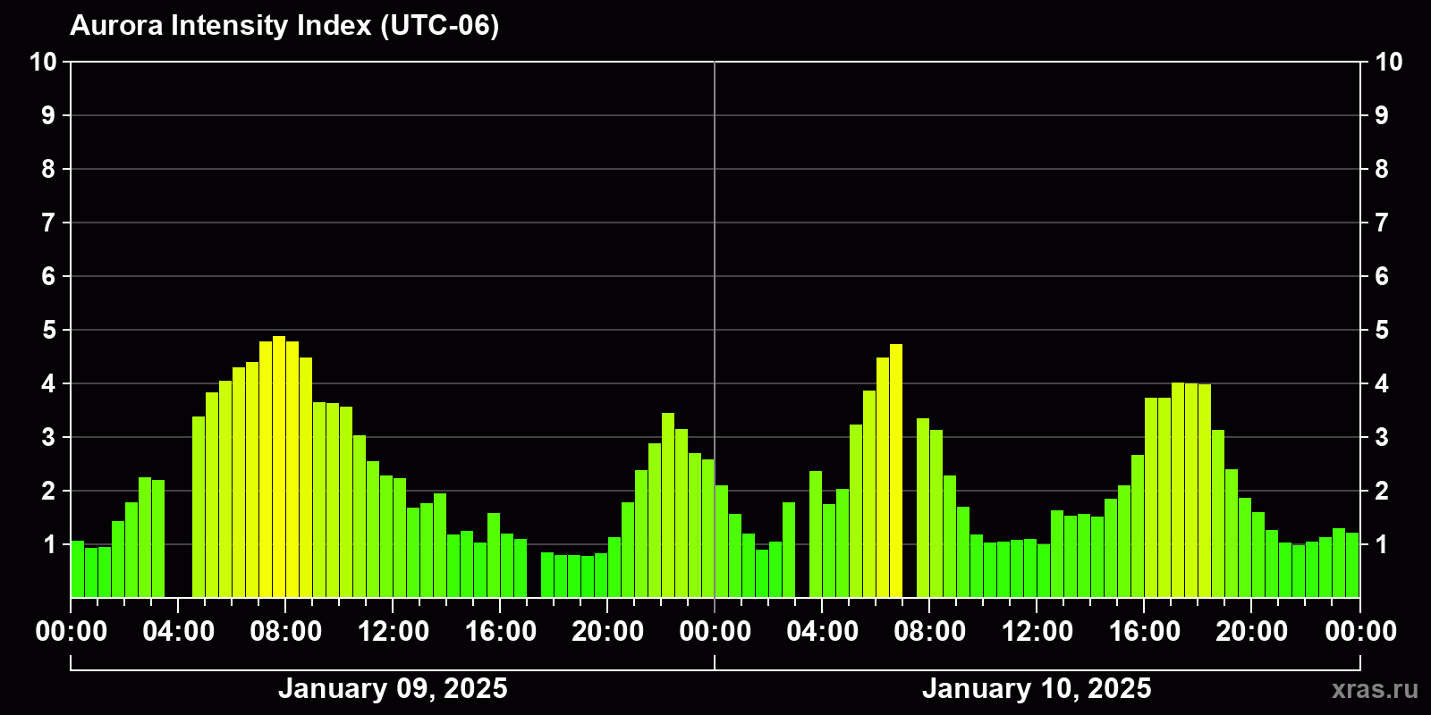 Auroral intensity index and the theoretically possible latitude of observations for nighttime in the Western Hemisphere as of 2025-01-10 23:46 (end of day) local time