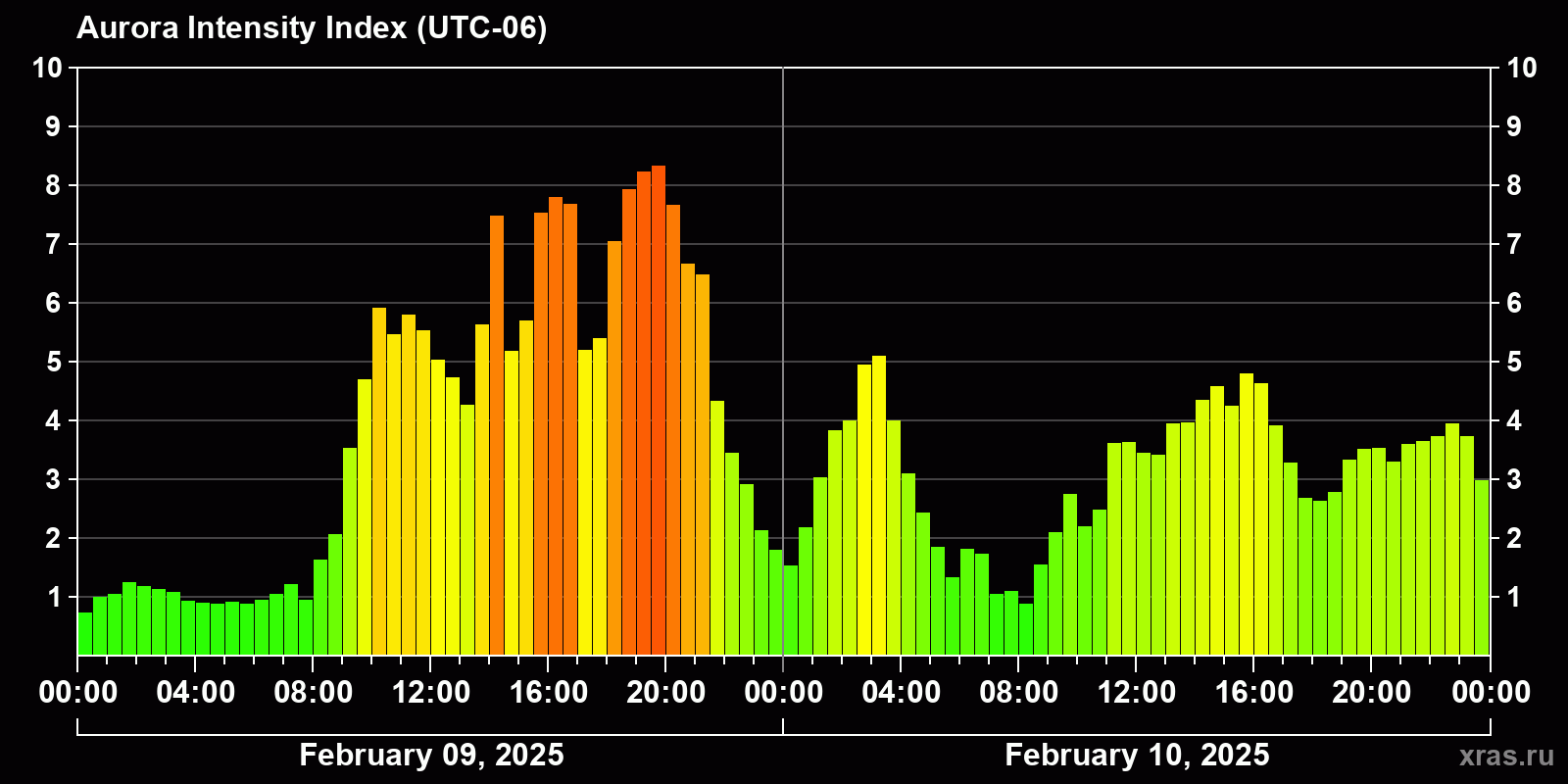 Changes in the auroral intensity index from 2025-02-09 to 2025-02-10 local time