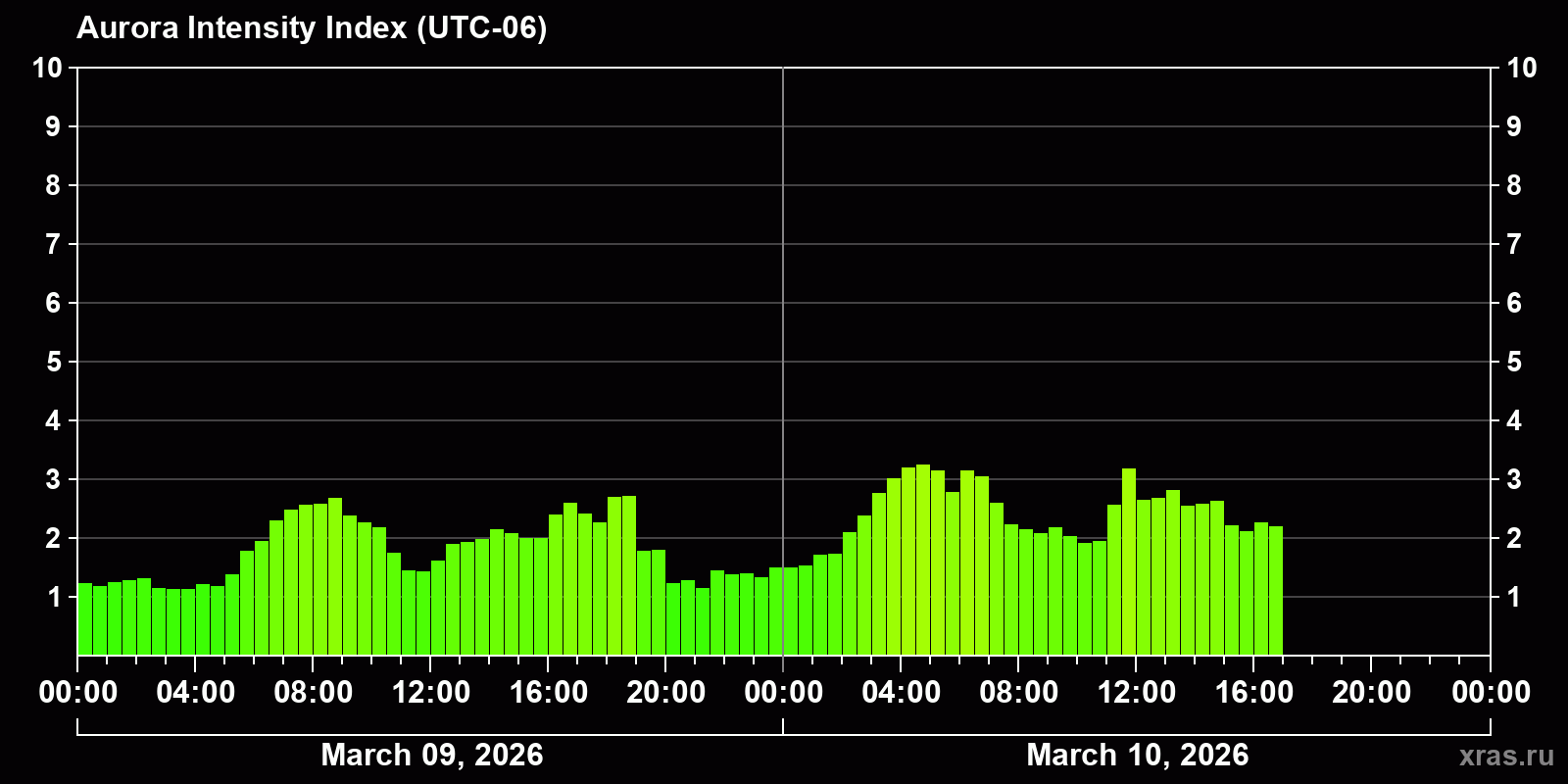 Auroral intensity index and the theoretically possible latitude of observations for nighttime in the Western Hemisphere as of 2026-03-10 15:30 (end of day) local time