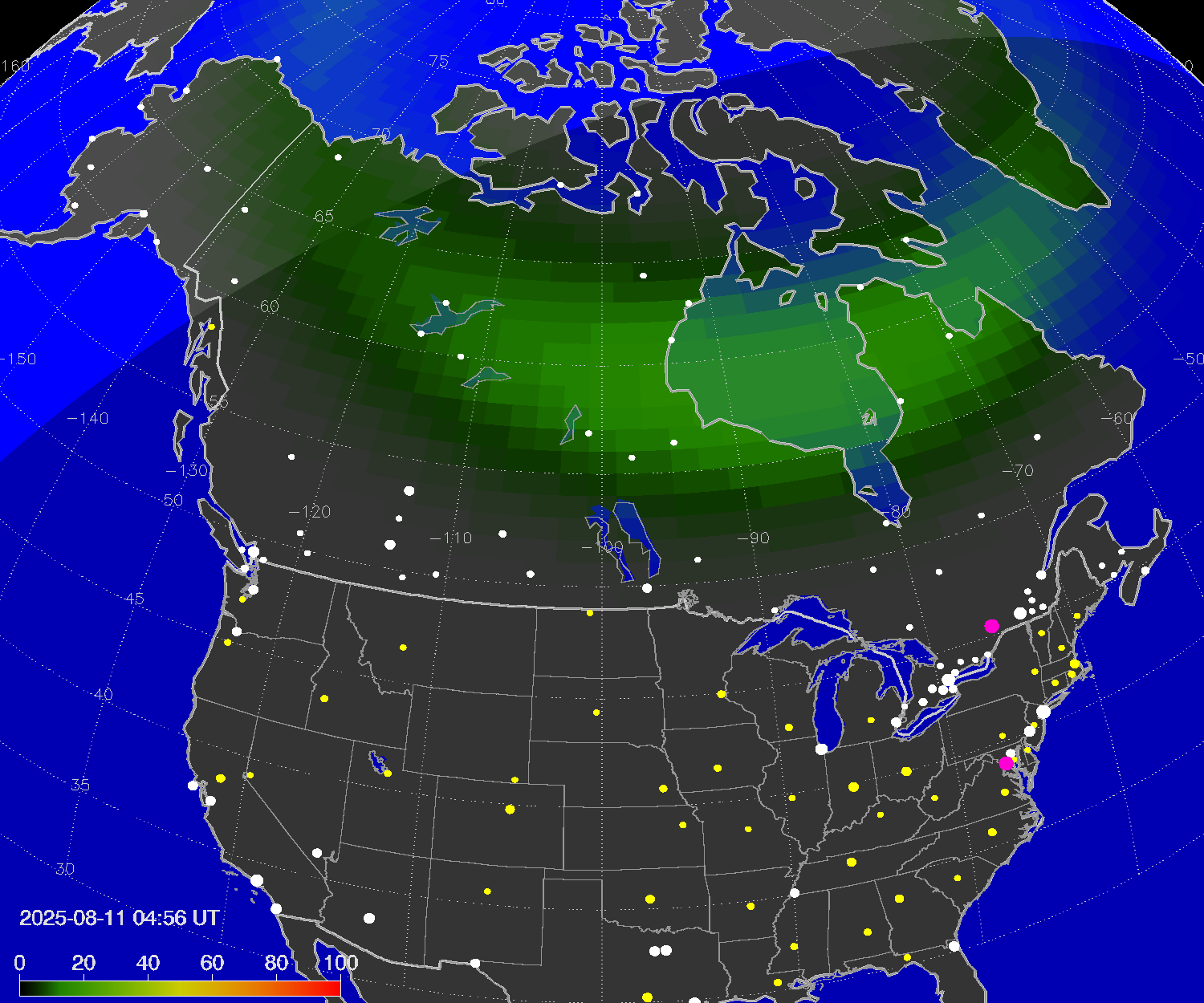 Probability of northern lights (auroras) in cities of Canada