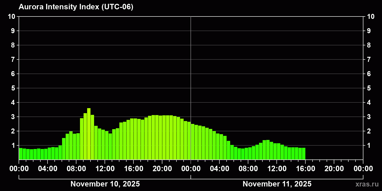 Changes in the auroral intensity index from 2025-11-10 to 2025-11-11 local time