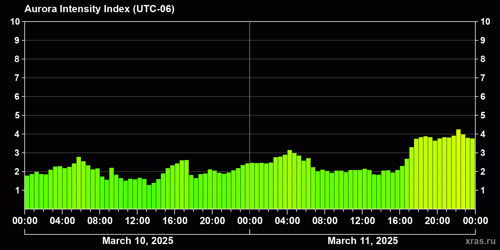 Changes in the auroral intensity index from 2025-03-10 to 2025-03-11 local time
