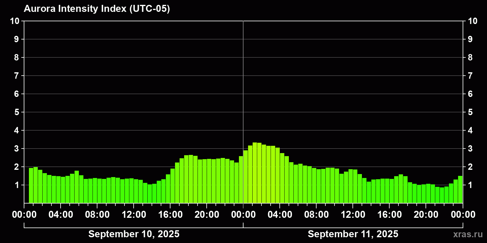 Auroral intensity index and the theoretically possible latitude of observations for nighttime in the Western Hemisphere as of 2025-09-11 23:47 (end of day) local time