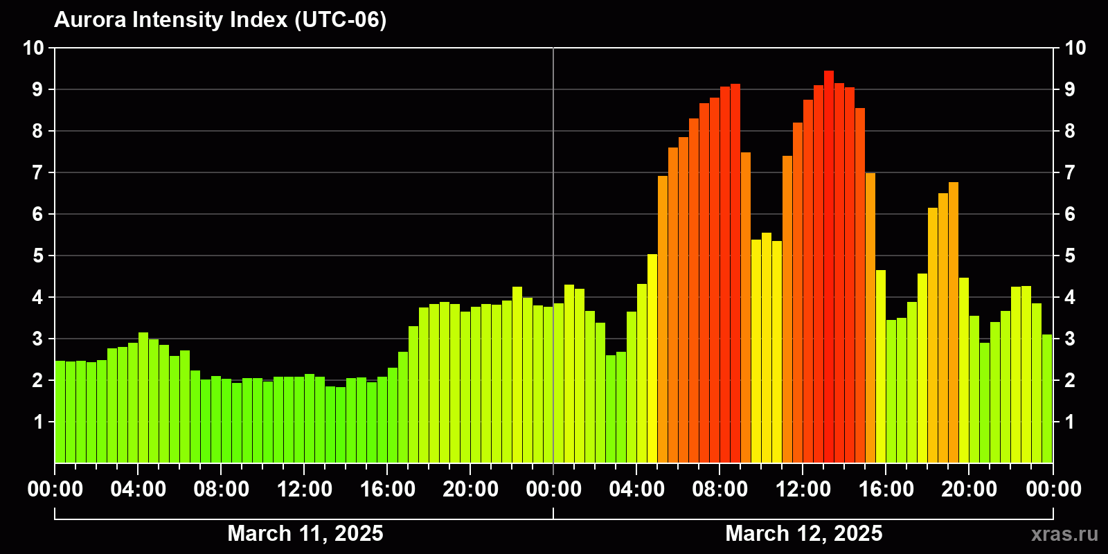 Auroral intensity index and the theoretically possible latitude of observations for nighttime in the Western Hemisphere as of 2025-03-12 23:59 (end of day) local time