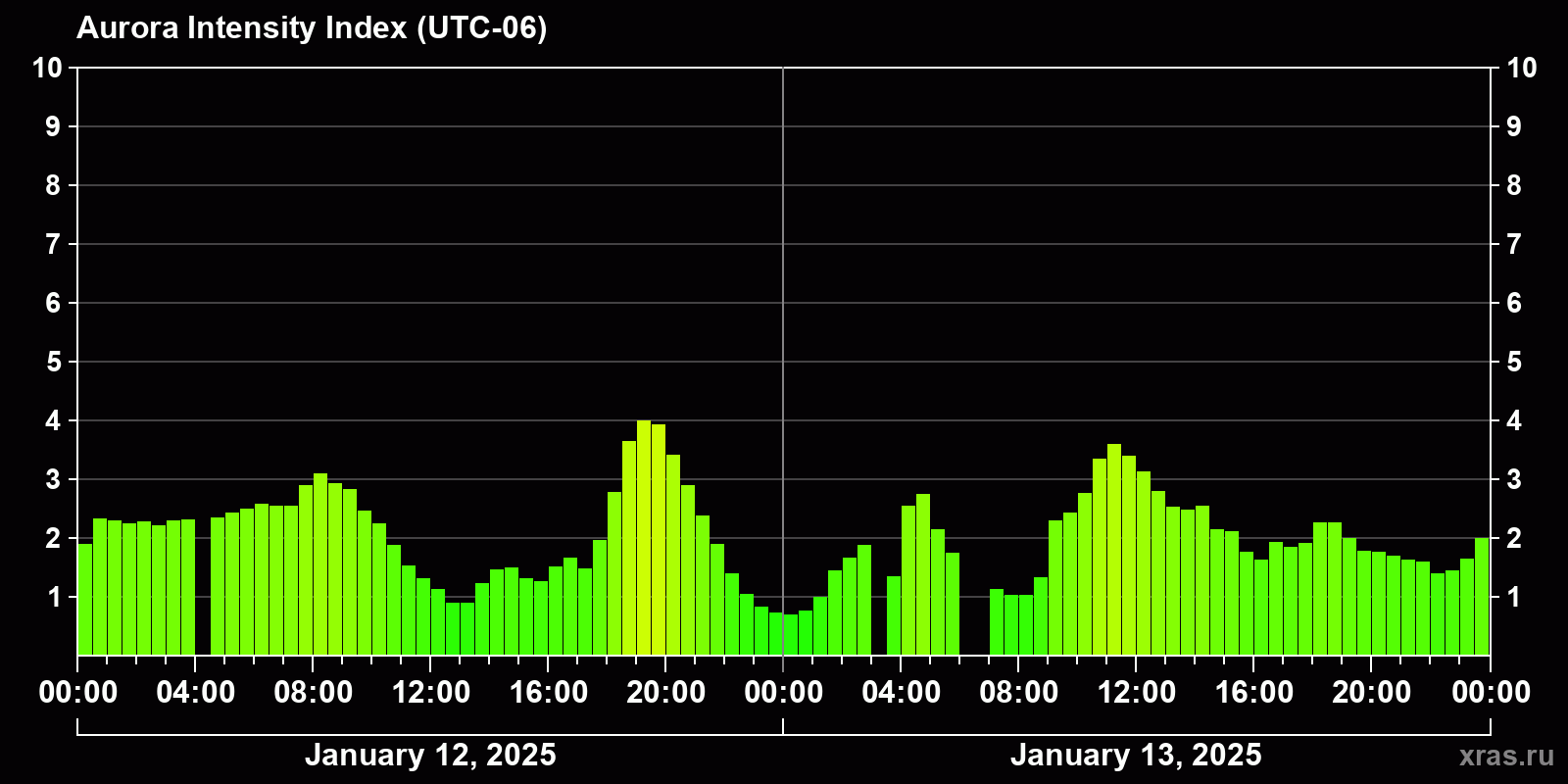 Changes in the auroral intensity index from 2025-01-12 to 2025-01-13 local time