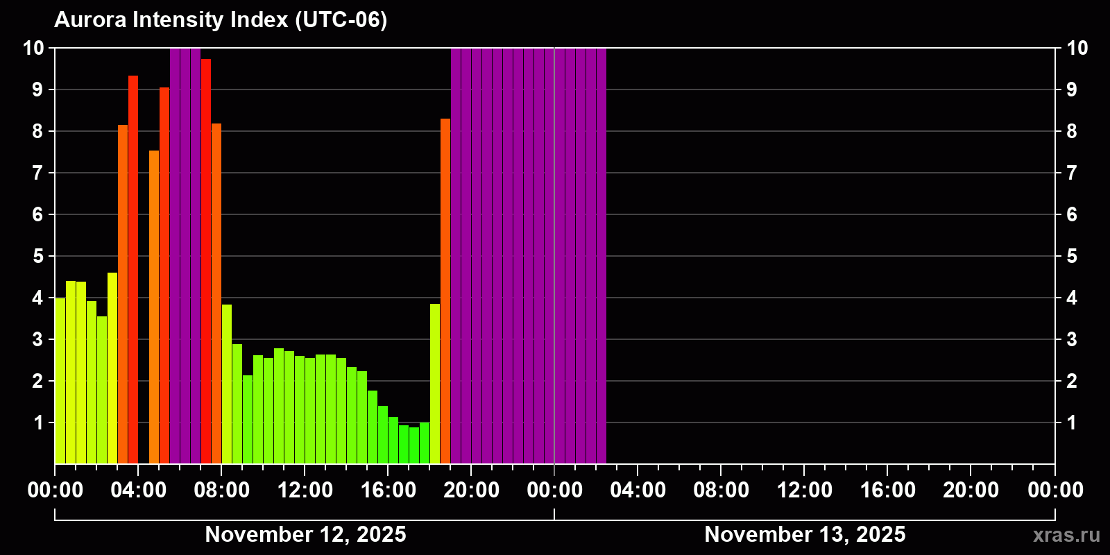 Auroral intensity index and the theoretically possible latitude of observations for nighttime in the Western Hemisphere as of 2025-11-13 00:56 (end of day) local time