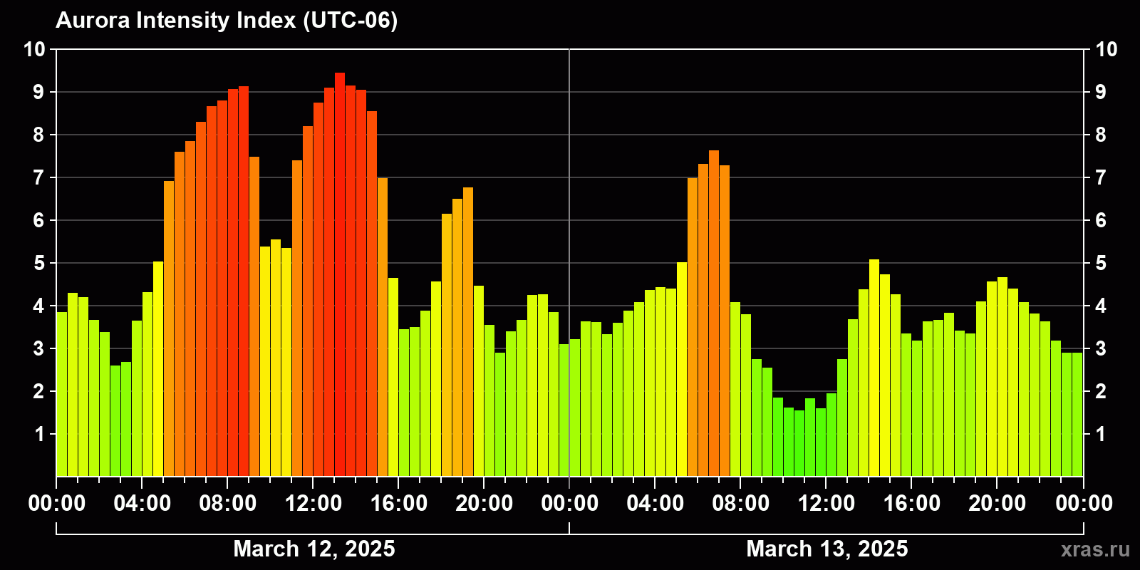 Auroral intensity index and the theoretically possible latitude of observations for nighttime in the Western Hemisphere as of 2025-03-13 23:46 (end of day) local time