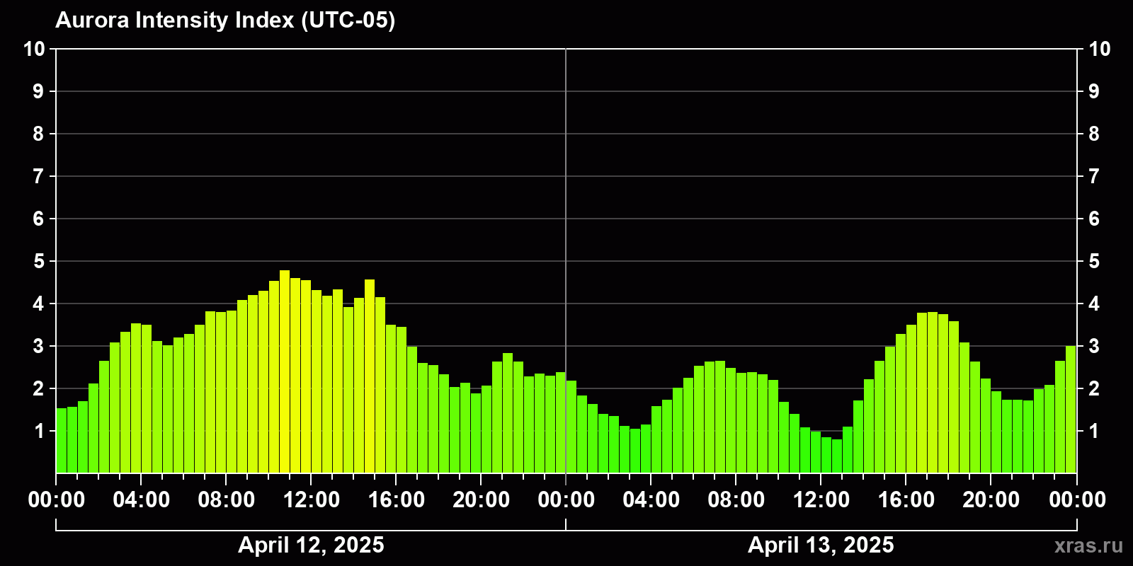 Auroral intensity index and the theoretically possible latitude of observations for nighttime in the Western Hemisphere as of 2025-04-13 23:48 (end of day) local time