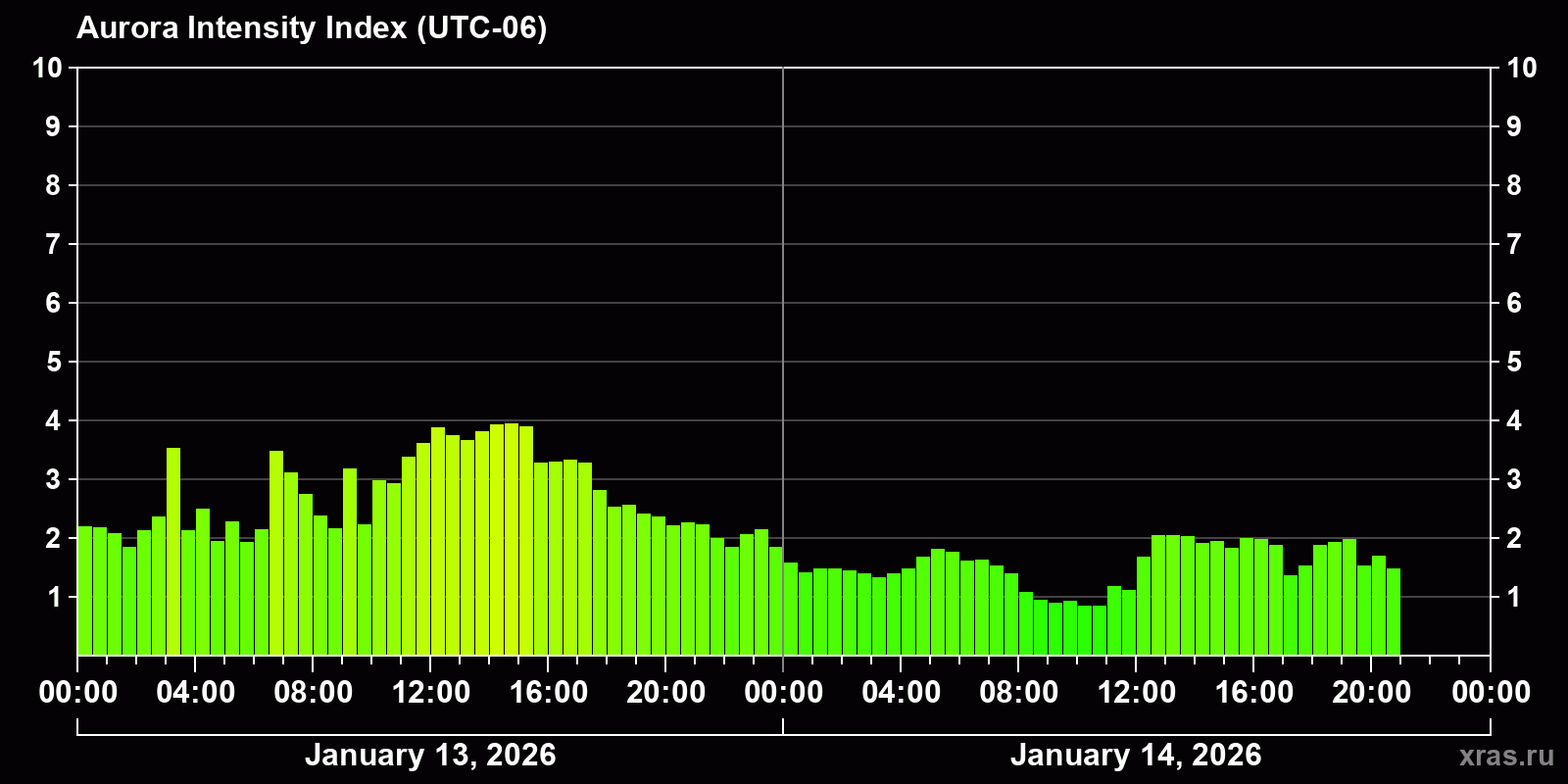 Auroral intensity index and the theoretically possible latitude of observations for nighttime in the Western Hemisphere as of 2026-01-14 17:11 (end of day) local time