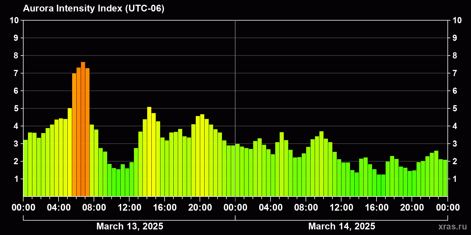 Changes in the auroral intensity index from 2025-03-13 to 2025-03-14 local time