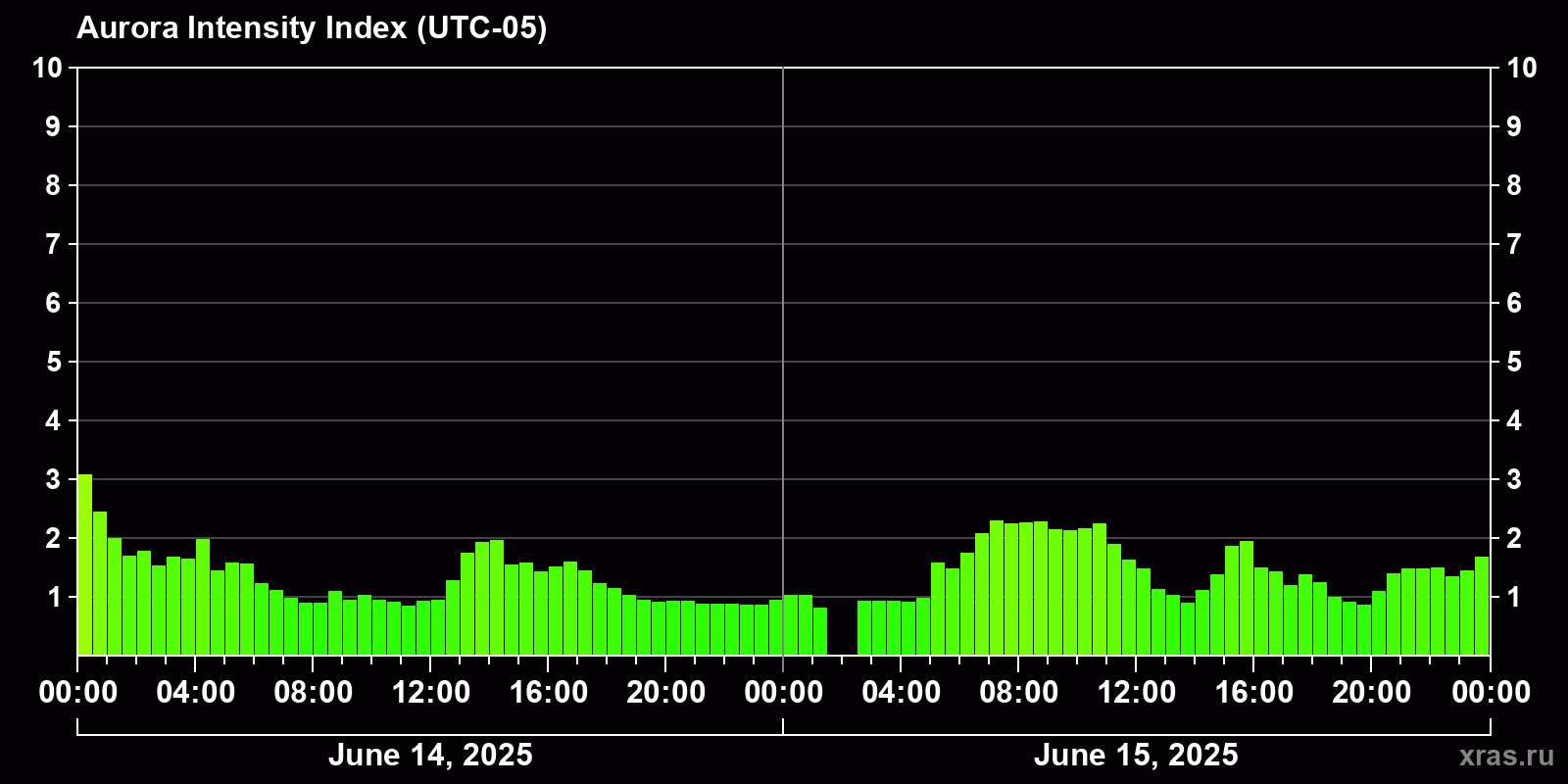 Auroral intensity index and the theoretically possible latitude of observations for nighttime in the Western Hemisphere as of 2025-06-15 23:57 (end of day) local time