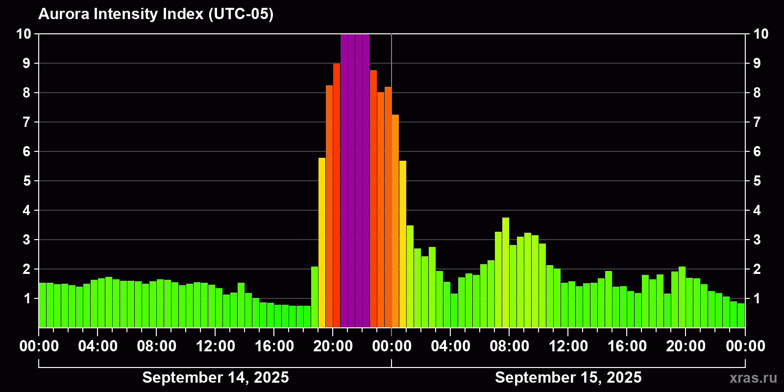 Changes in the auroral intensity index from 2025-09-14 to 2025-09-15 local time