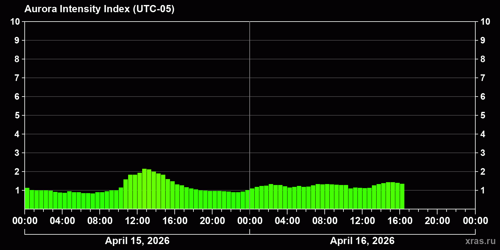 Auroral intensity index and the theoretically possible latitude of observations for nighttime in the Western Hemisphere as of 2026-04-16 14:42 (end of day) local time