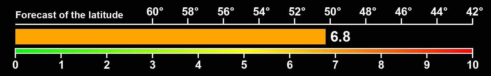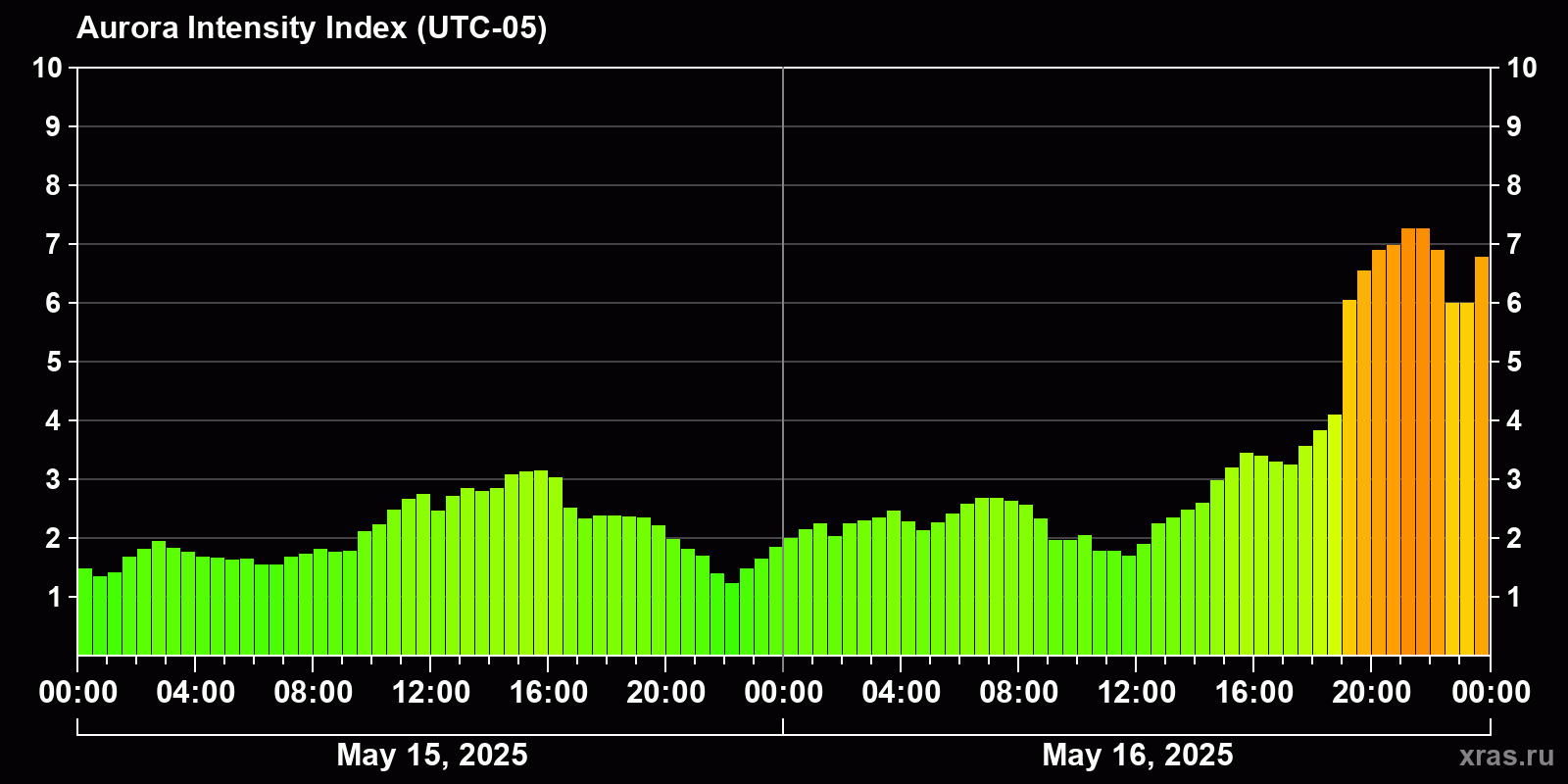 Auroral intensity index and the theoretically possible latitude of observations for nighttime in the Western Hemisphere as of 2025-05-16 23:50 (end of day) local time