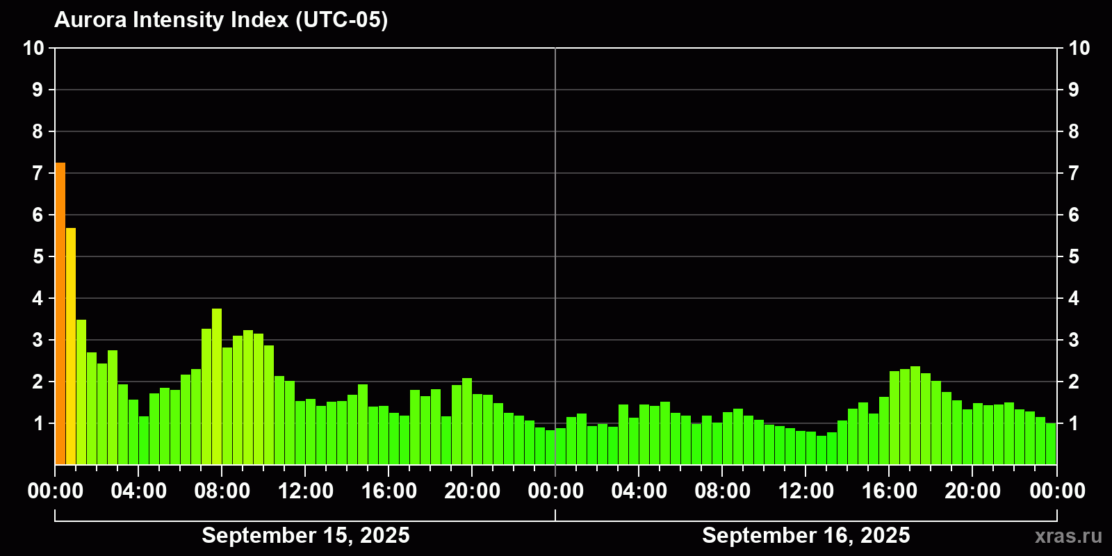 Auroral intensity index and the theoretically possible latitude of observations for nighttime in the Western Hemisphere as of 2025-09-16 23:46 (end of day) local time