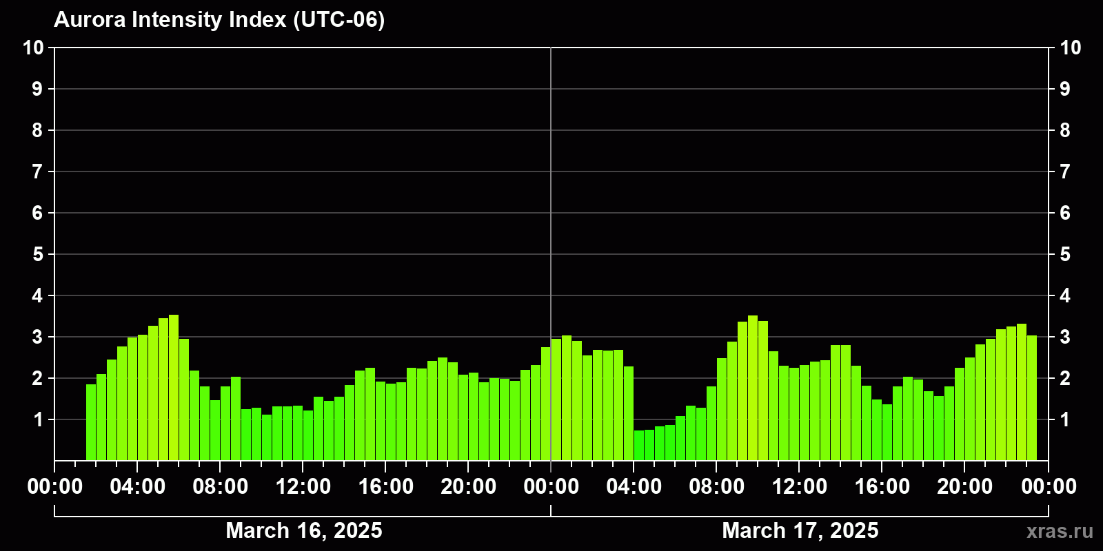 Auroral intensity index and the theoretically possible latitude of observations for nighttime in the Western Hemisphere as of 2025-03-17 23:28 (end of day) local time