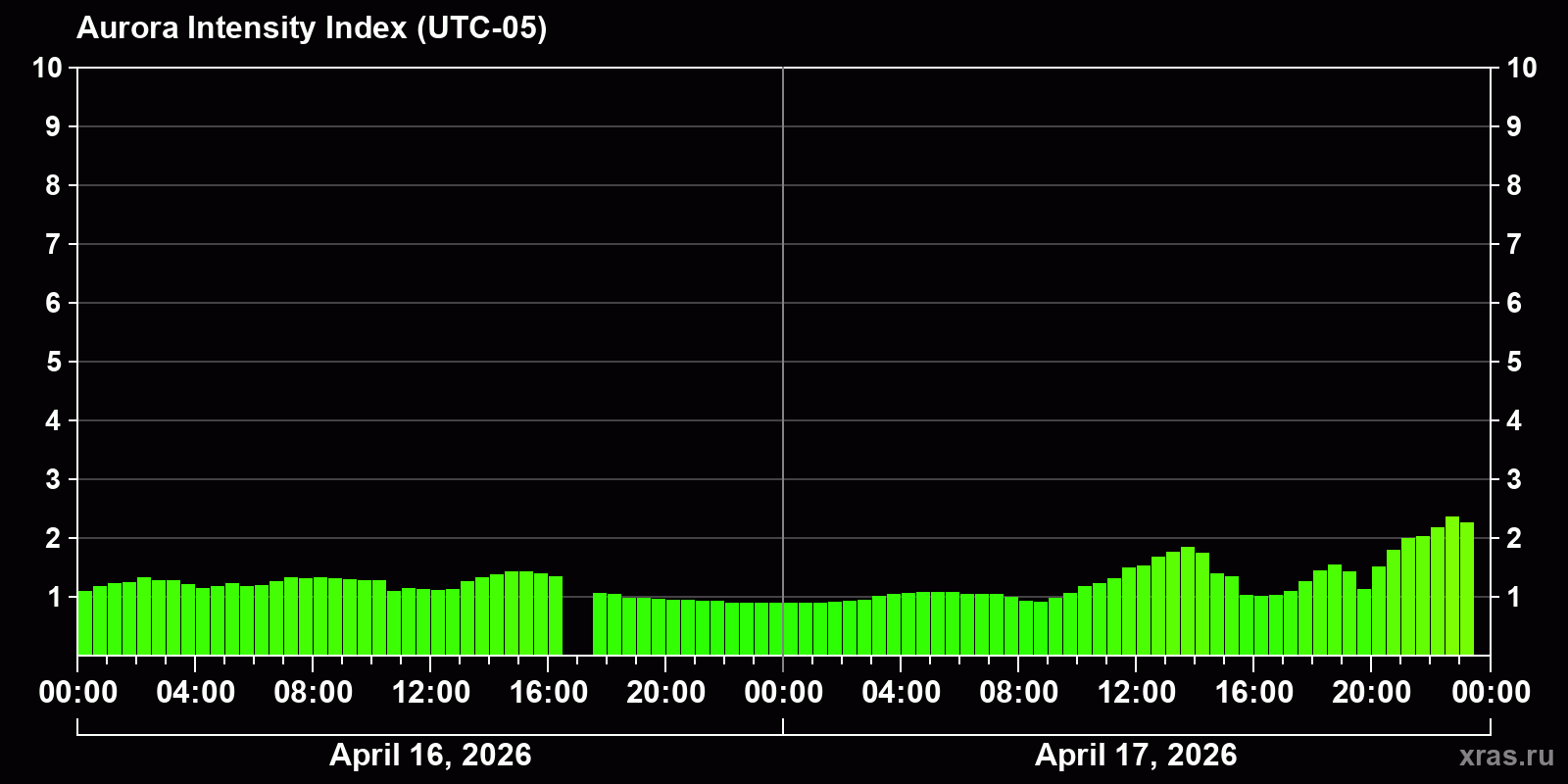 Auroral intensity index and the theoretically possible latitude of observations for nighttime in the Western Hemisphere as of 2026-04-17 21:24 (end of day) local time