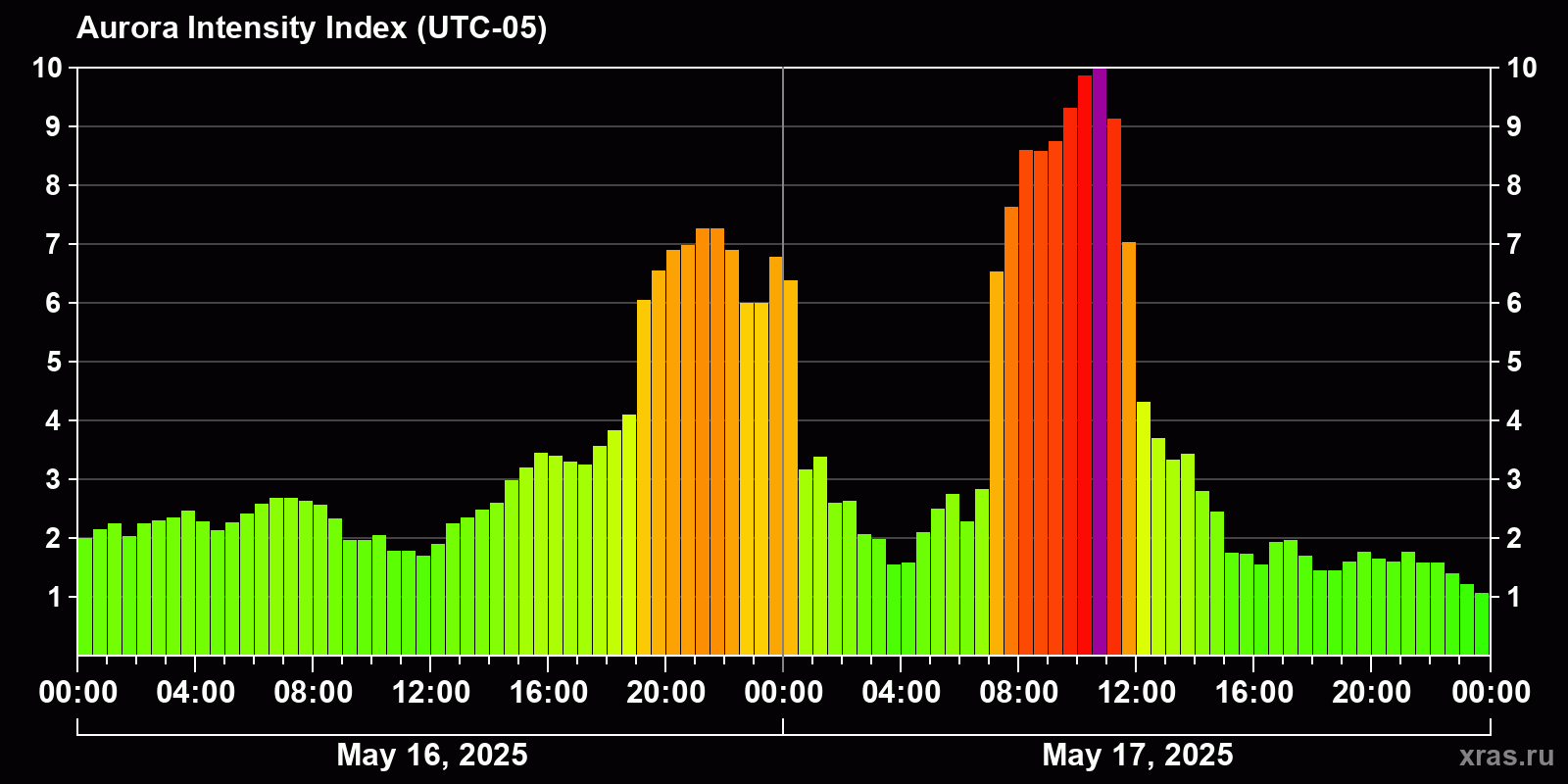 Auroral intensity index and the theoretically possible latitude of observations for nighttime in the Western Hemisphere as of 2025-05-17 23:59 (end of day) local time