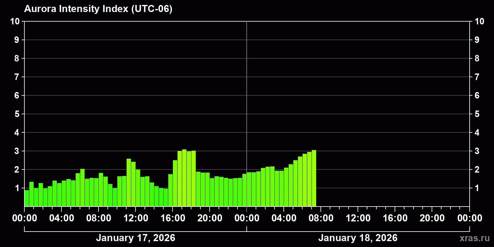 Auroral intensity index and the theoretically possible latitude of observations for nighttime in the Western Hemisphere as of 2026-01-18 03:39 (end of day) local time