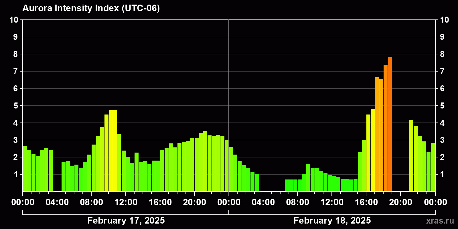 Auroral intensity index and the theoretically possible latitude of observations for nighttime in the Western Hemisphere as of 2025-02-18 23:57 (end of day) local time