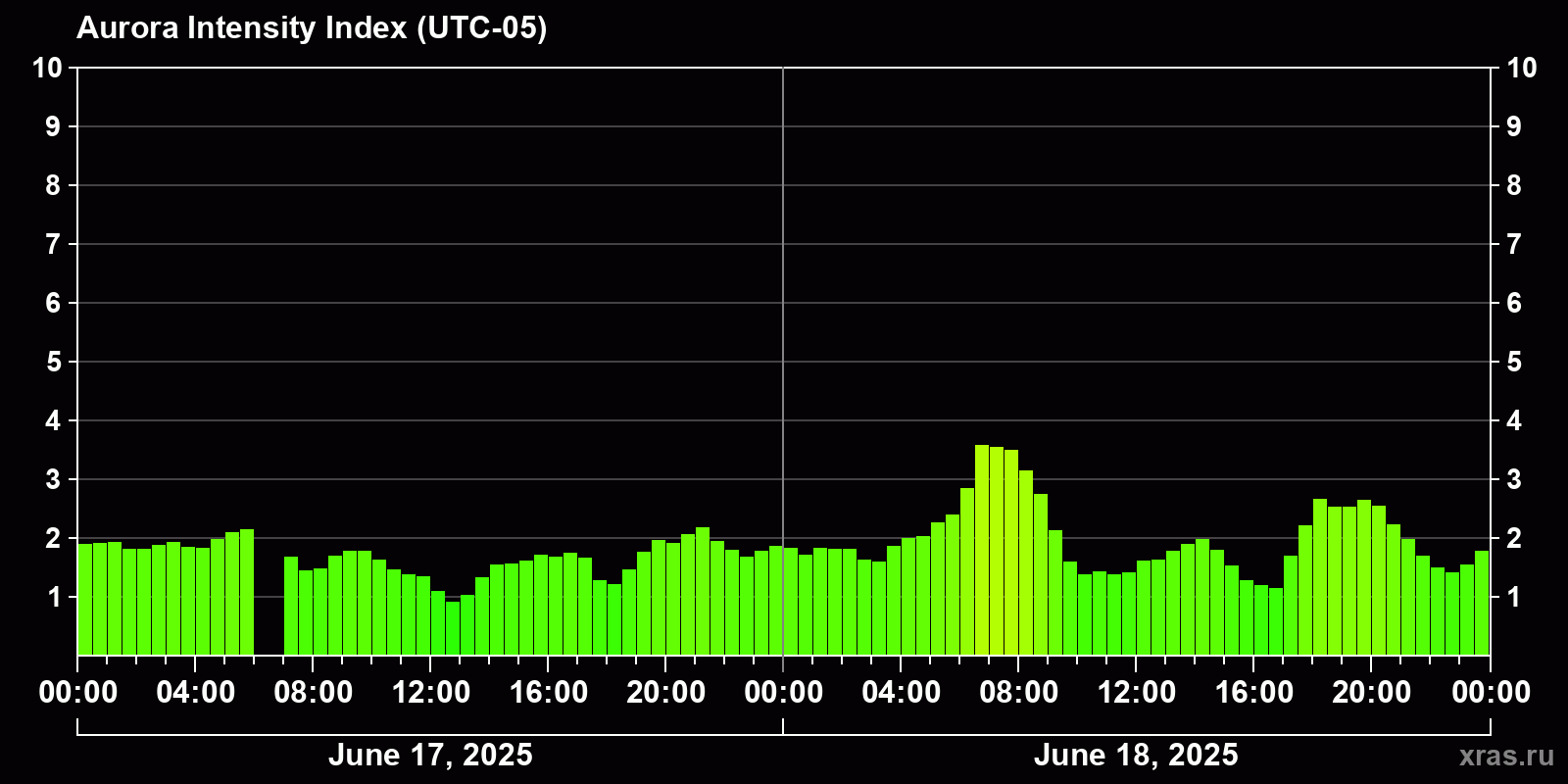 Auroral intensity index and the theoretically possible latitude of observations for nighttime in the Western Hemisphere as of 2025-06-18 23:55 (end of day) local time