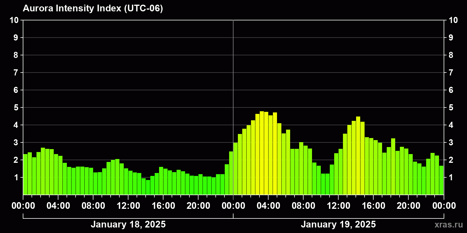 Changes in the auroral intensity index from 2025-01-18 to 2025-01-19 local time