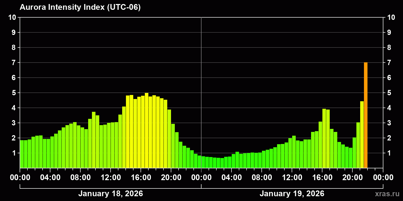 Auroral intensity index and the theoretically possible latitude of observations for nighttime in the Western Hemisphere as of 2026-01-19 15:36 (end of day) local time