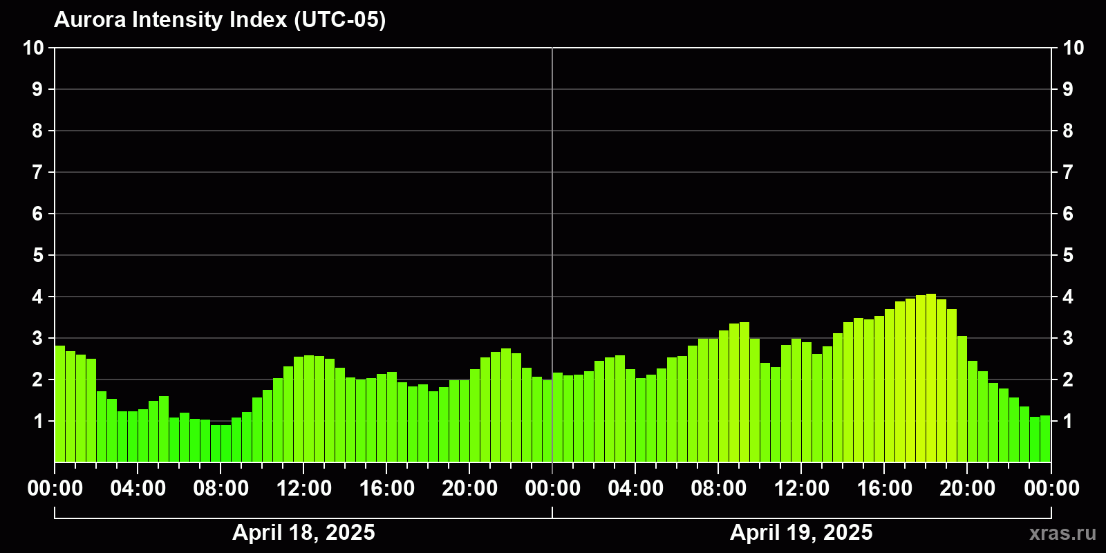 Auroral intensity index and the theoretically possible latitude of observations for nighttime in the Western Hemisphere as of 2025-04-19 23:53 (end of day) local time