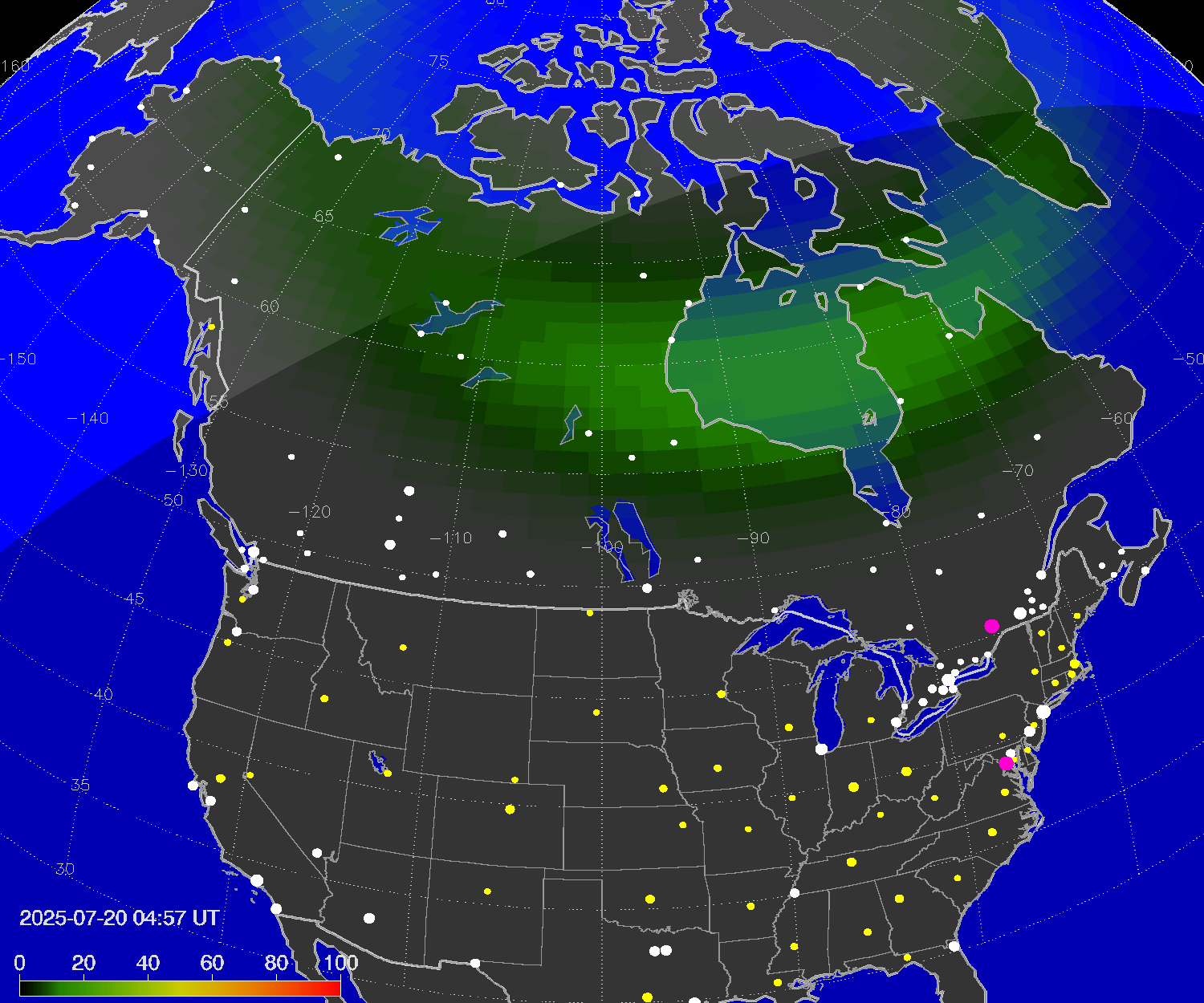 Probability of northern lights (auroras) in cities of Canada