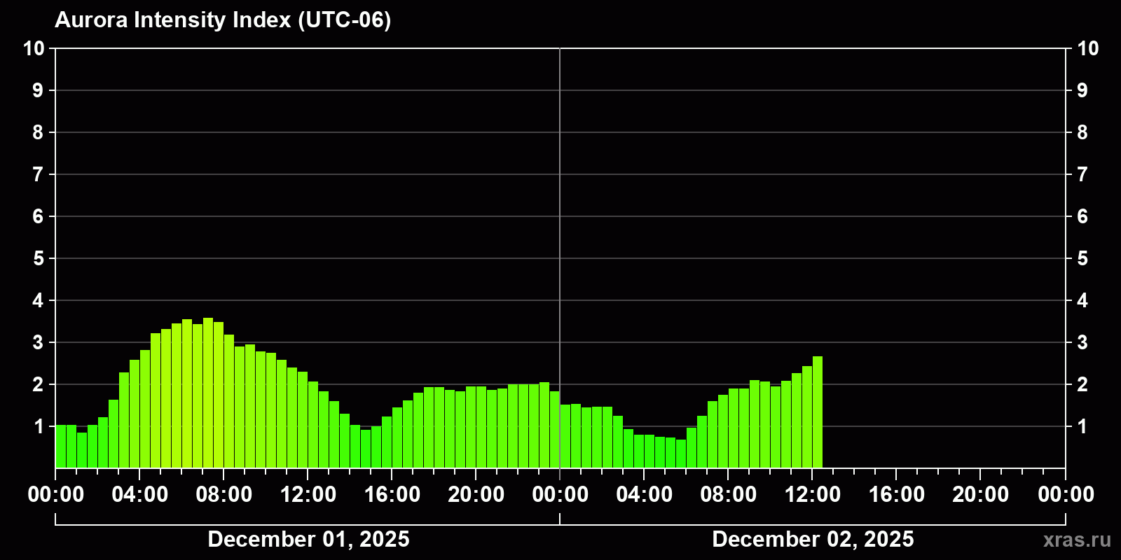 Auroral intensity index and the theoretically possible latitude of observations for nighttime in the Western Hemisphere as of 2025-12-02 11:13 (end of day) local time