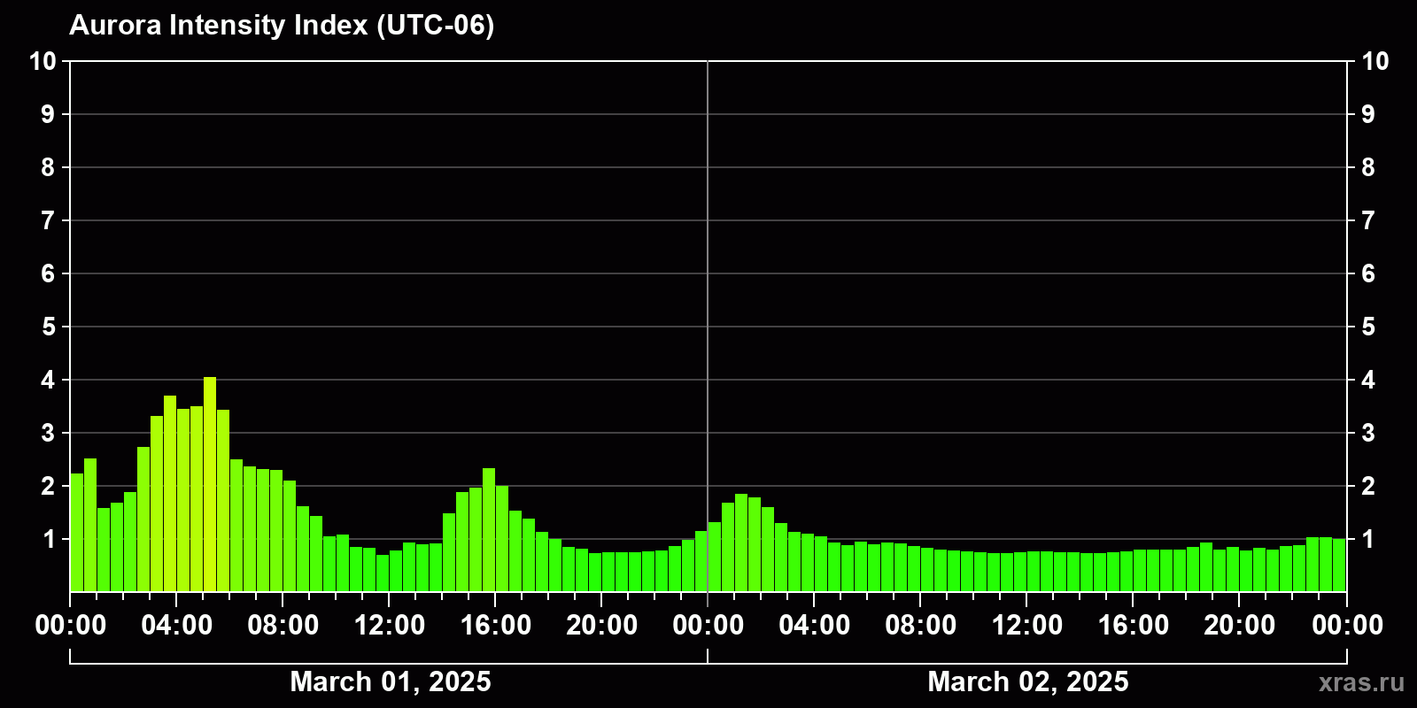 Changes in the auroral intensity index from 2025-03-01 to 2025-03-02 local time