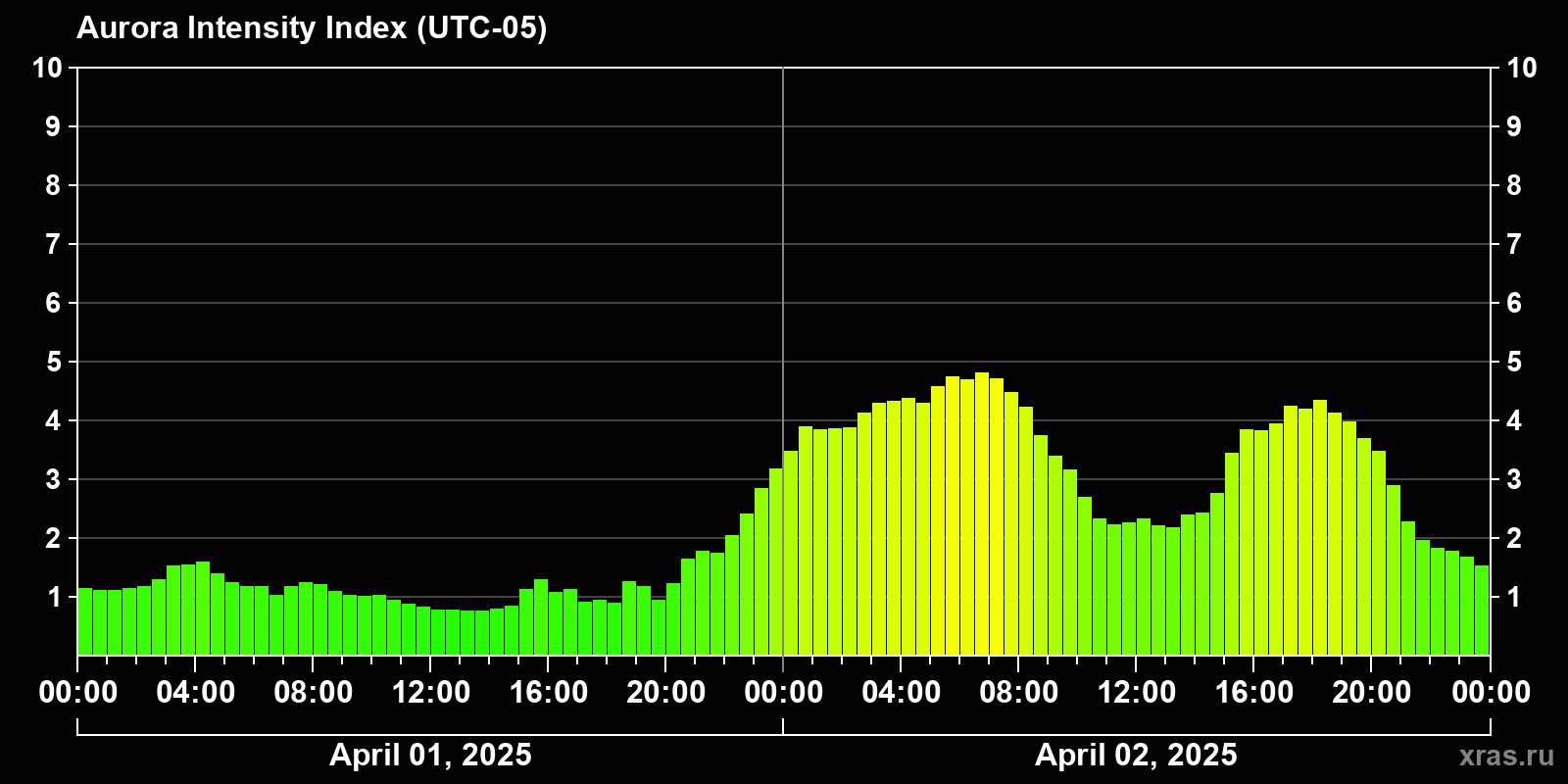 Auroral intensity index and the theoretically possible latitude of observations for nighttime in the Western Hemisphere as of 2025-04-02 23:52 (end of day) local time