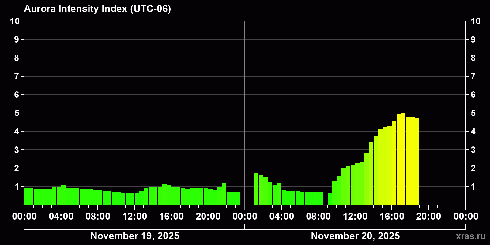 Auroral intensity index and the theoretically possible latitude of observations for nighttime in the Western Hemisphere as of 2025-11-20 17:24 (end of day) local time