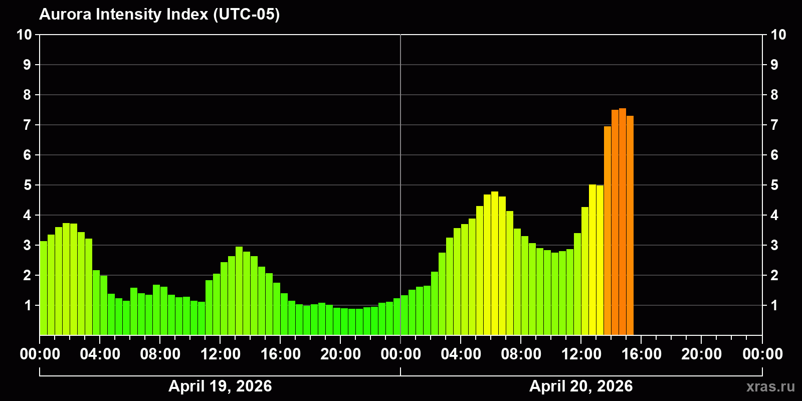 Auroral intensity index and the theoretically possible latitude of observations for nighttime in the Western Hemisphere as of 2026-04-20 13:46 (end of day) local time