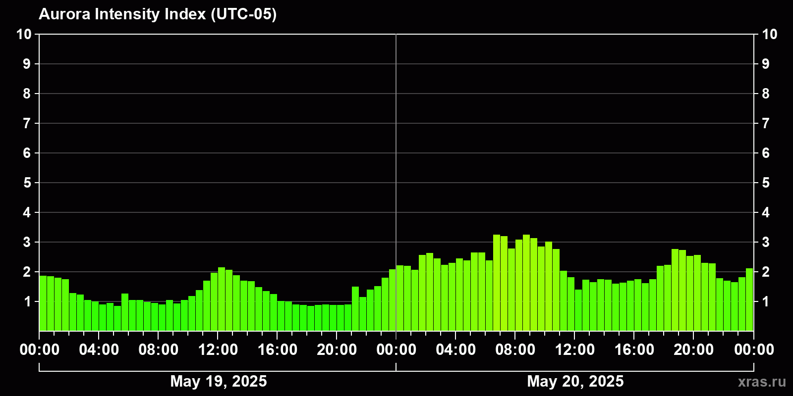Auroral intensity index and the theoretically possible latitude of observations for nighttime in the Western Hemisphere as of 2025-05-20 23:52 (end of day) local time