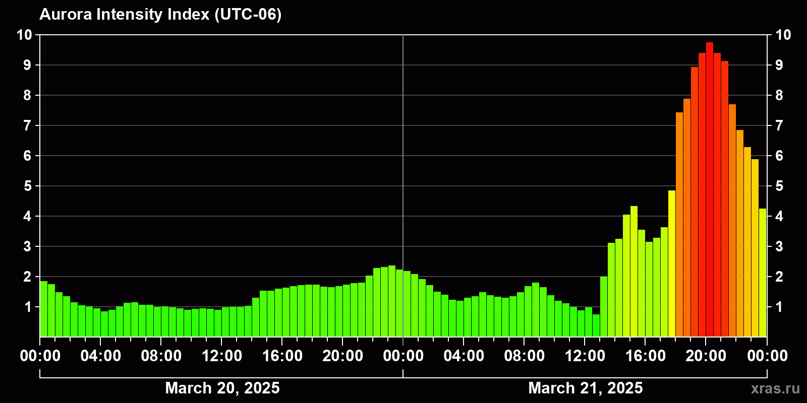 Changes in the auroral intensity index from 2025-03-20 to 2025-03-21 local time