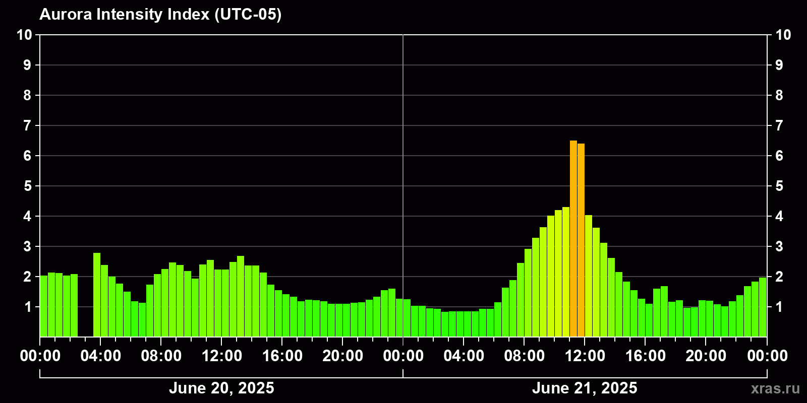 Auroral intensity index and the theoretically possible latitude of observations for nighttime in the Western Hemisphere as of 2025-06-21 23:47 (end of day) local time