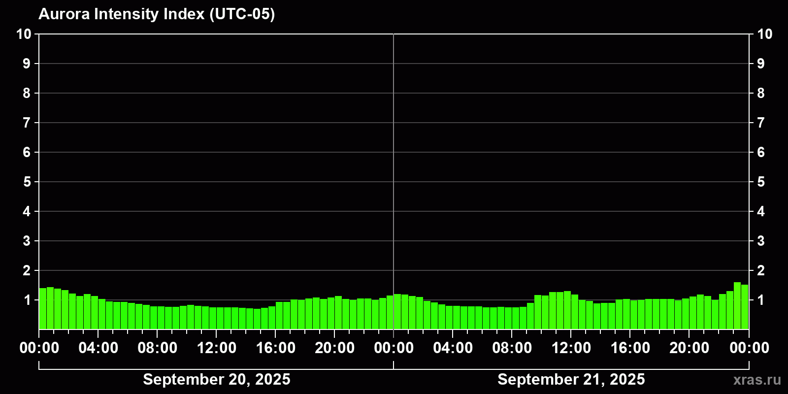 Auroral intensity index and the theoretically possible latitude of observations for nighttime in the Western Hemisphere as of 2025-09-21 23:58 (end of day) local time