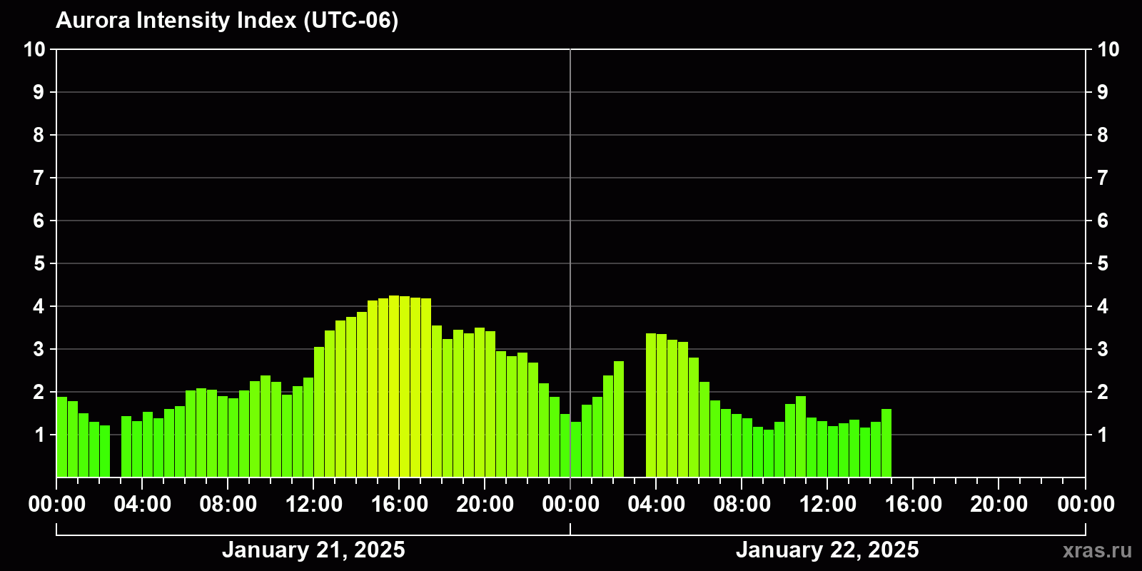 Changes in the auroral intensity index from 2025-01-21 to 2025-01-22 local time