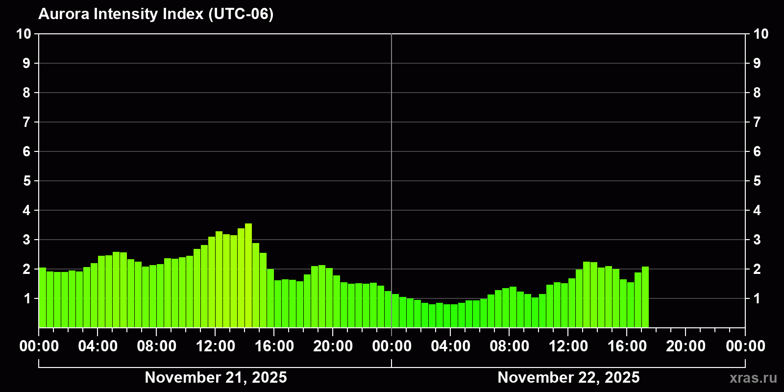 Changes in the auroral intensity index from 2025-11-21 to 2025-11-22 local time