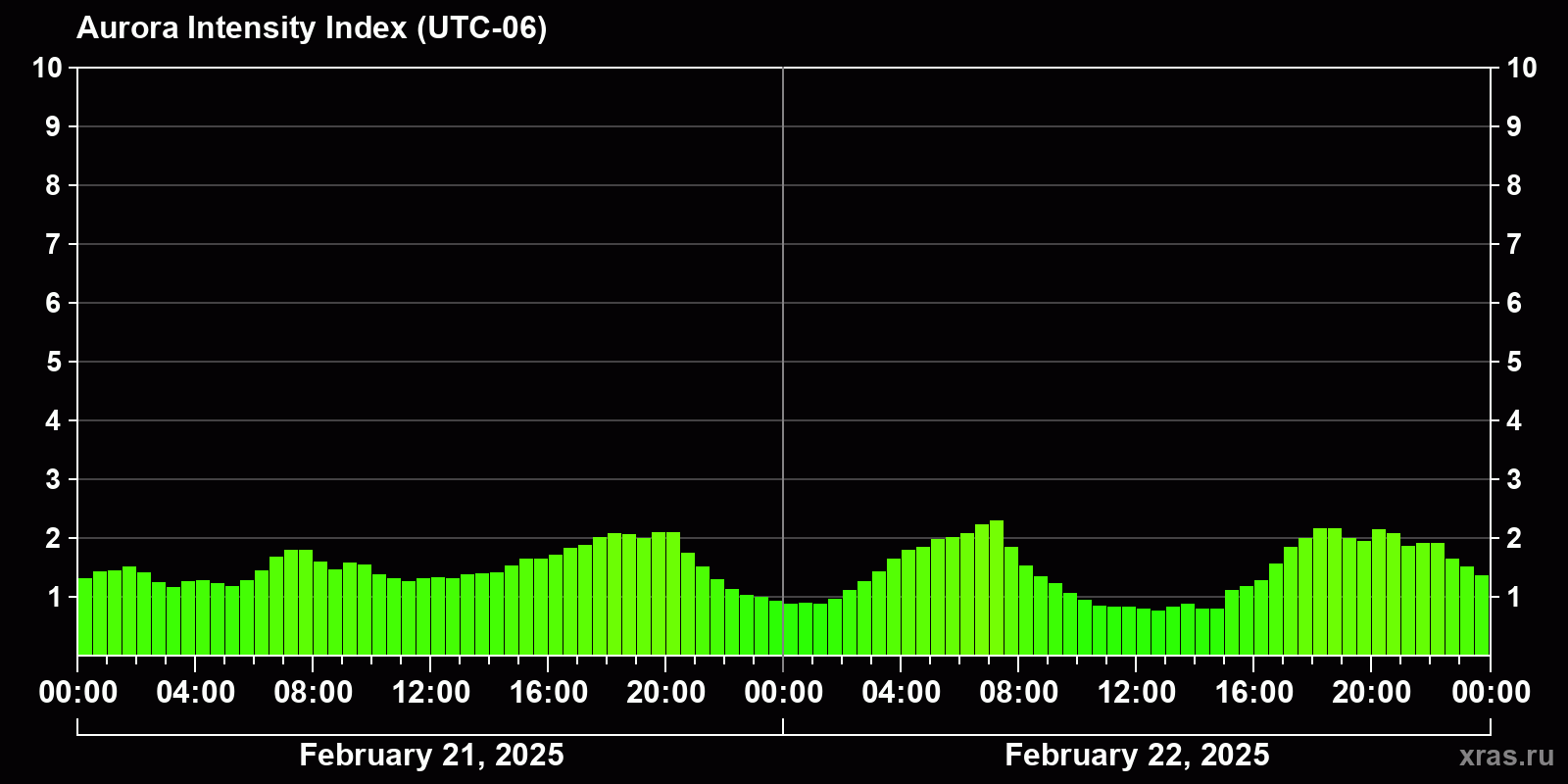 Auroral intensity index and the theoretically possible latitude of observations for nighttime in the Western Hemisphere as of 2025-02-22 23:48 (end of day) local time